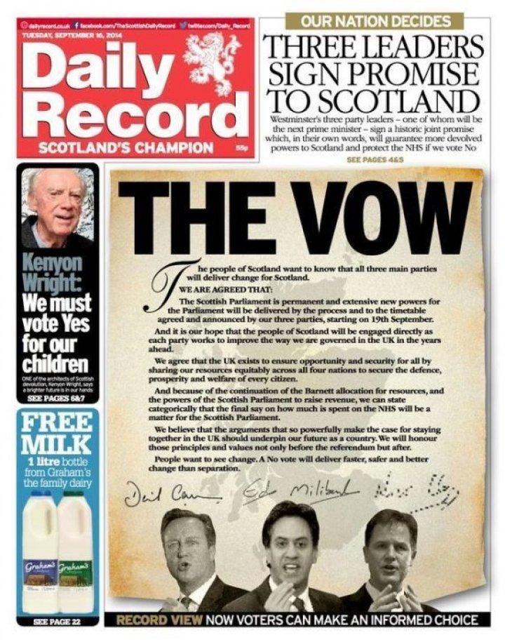 Los tres políticos han dejado de lado sus diferencias para prometer que el 'no' en el referéndum significará una transferencia de autonomía a Escocia y, con ella, la protección de otros servicios públicos vitales en la región. El comunicado, firmado por los tres políticos, ha sido publicado por el diario británico Daily Record, habría sido negociado por el ex primer ministro Gordon Brown y por los laboristas escoceses. El objetivo es que un documento de estas características aporte "plena confianza" sobre las propuestas que Cameron, Clegg y Miliband vienen realizando.
