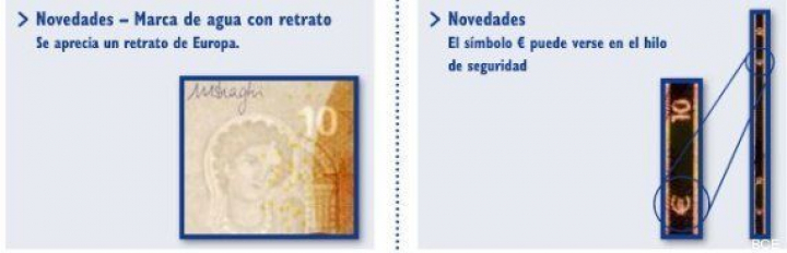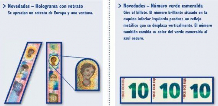 También incluye un número verde esmeralda, según el BCE. Al inclinarlo, el número brillante produce un reflejo metálico que se desplaza verticalmente y cambia su color del verde esmeralda al azul oscuro. Gracias a estos y otros elementos, es muy fácil comprobar la autenticidad del nuevo billete de 10 euros utilizando el método 'toque, mire, gire'.