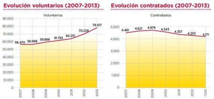 Cáritas Española se apoya en el trabajo gratuito desarrollado a través de 7.194 centros y servicios por 78.017 voluntarios -30 % más en los últimos cinco años- y 4.171 trabajadores remunerados, así como en las aportaciones de miles de donantes anónimos y la colaboración privada. Dos gráficos de la memoria anual de la entidad católica muestra cómo ha aumentado el número de voluntarios a la vez que se han reducido los contratados.