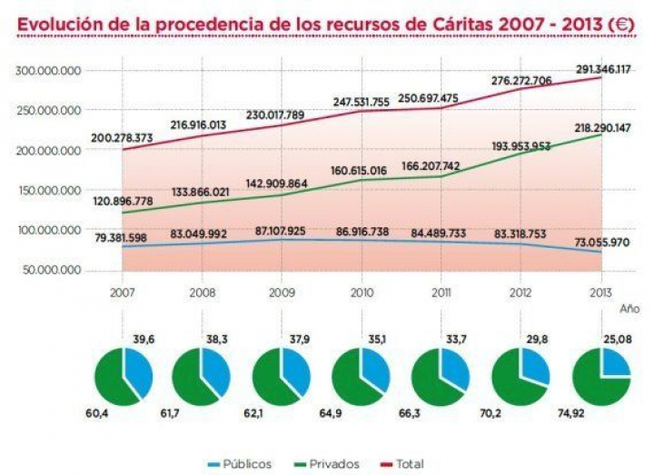 La financiación pública de la ayuda a los más necesitados sigue en caída. Cáritas ha conseguido sin embargo atender a cinco millones de personas en 2013, la mitad de ellas en España, e invirtió 291 millones de euros, 15 millones más que en 2012. El 75% de estos fondos, es decir, 218.290.147 de euros procedieron de aportaciones privadas.