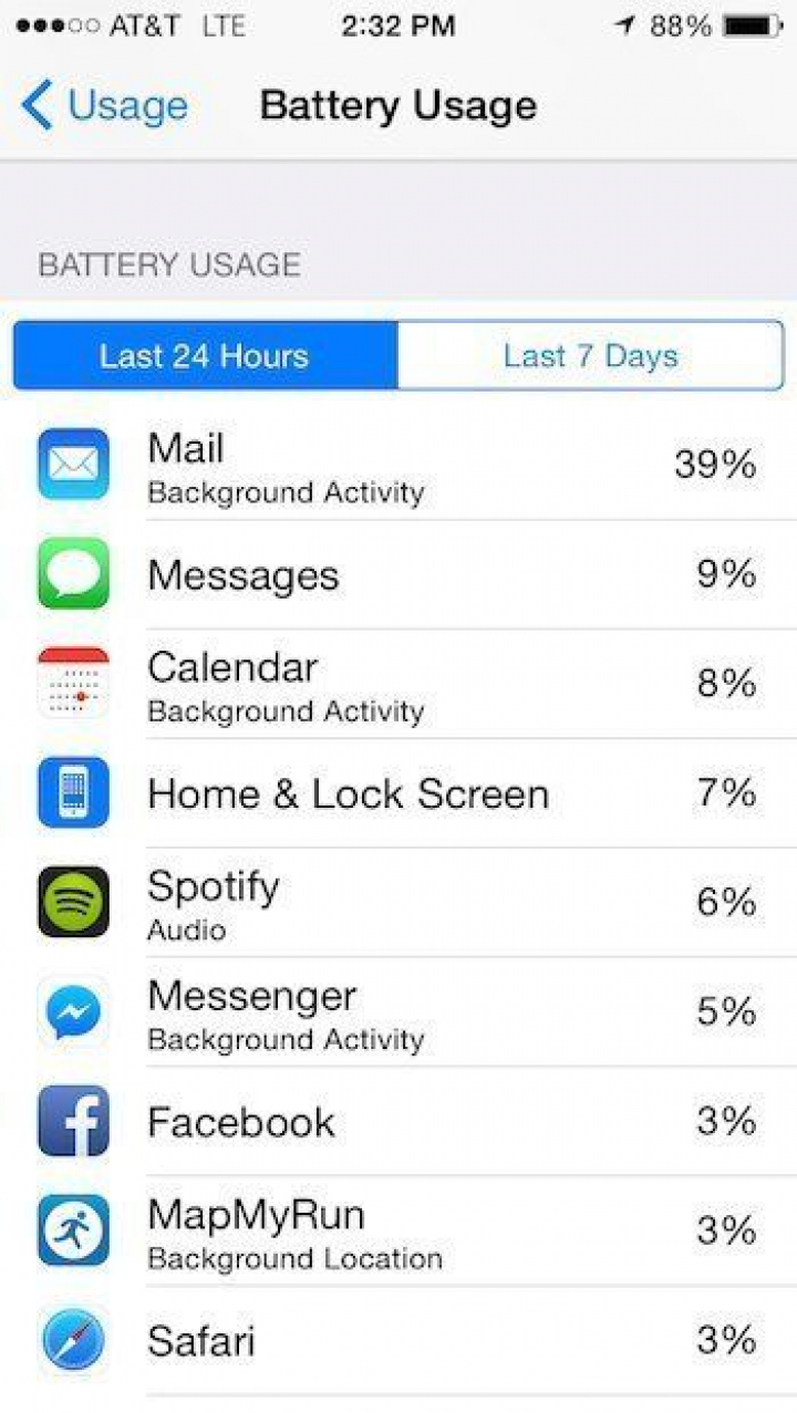 Apple no ha creado una batería invencible para su nuevo móvil, pero sí que ha incluido una forma de monitorear la vida de la batería de tu móvil. Con iOS8, puedes ver detalladamente el desglose de qué apps están usando más batería. Vete a Ajustes > General > Uso> Uso de la batería. Ahí, puedes encontrar qué aplicaciones han estado consumiendo tu batería en las últimas 24 horas o semana. Ahora cuando estés en un bar con un 4% de batería, sabrás exactamente a qué app culpar.