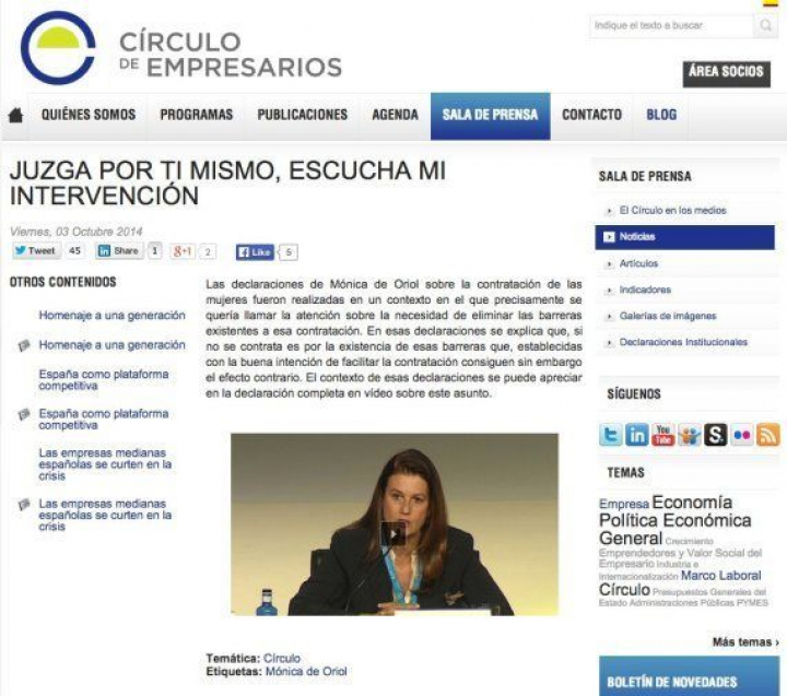 Mónica de Oriol, presidenta del Círculo de Empresarios, se defiende tras sus polémicas palabras sobre no contratar a mujeres embarazadascolgando el vídeo de su intervención en la web de la organización que dirige al que acompaña un breve comunicado bajo el título "Juzga por ti mismo, escucha mi intervención":