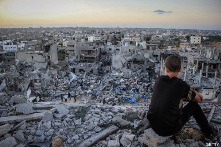 Un niño palestina observa las ruinas de centenares de casas destruidas en la Franja de Gaza.