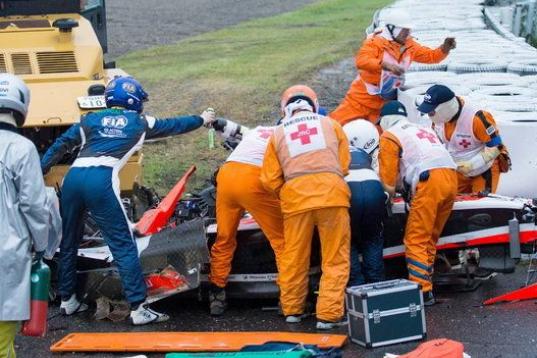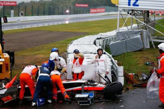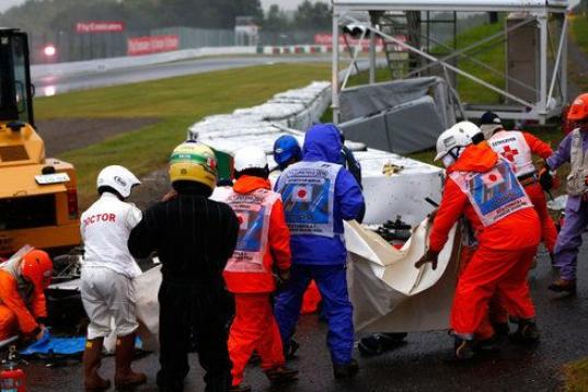 Bianchi impactó contra la grúa que estaba retirando el monoplaza de Adrian Sutil, accidentado vueltas atrás, a falta de siete vueltas para el final del Gran Premio. Poco después, se decretó el final de la prueba debido a las dificultades metereológicas generadas por culpa de la lluvia.
