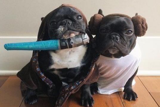 Al bulldog francés Trottery su hermano Winter el disfraz de la Princesa Leia y Obi-Wan Kenobi les sienta como anillo al dedo.