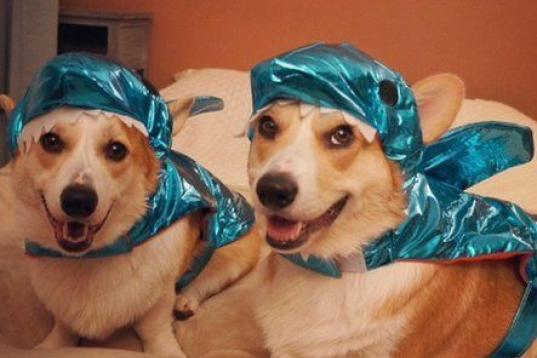 Los hermanos de raza corgi Corgnelius y Stumphrey están terroríficos en azul.