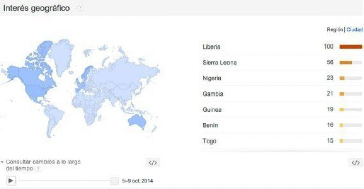 Este mapa de Google Trends muestra cómo ha evolucionado el interés en el ébola a través de las búsquedas en esta web a lo largo del tiempo. Los últimos casos que están siendo tratados fuera de África han cambiado radicalmente el interés sobre el virus en EEUU y Europa. El mapa es interactivo y se puede ver la evolución de la preocupación en el mundo aquí.