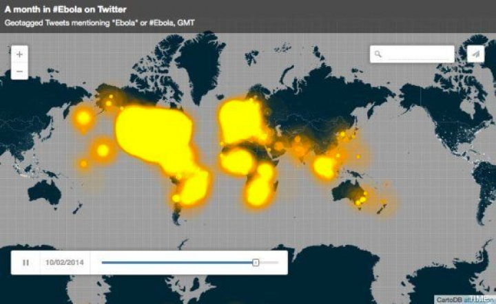 Otro mapa que muestra el interés mundial en el ébola es este que publica Time, en el que se geolocalizan en un mapa los tuits emitidos desde el 9 de julio. Como se puede ver en este pantallazo (el mapa interactivo se puede consultar aquí), estos últimos días el interés por el virus se ha disparado.