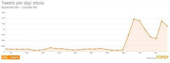 Topsy, la herramienta que analiza Twitter y sus mensajes más populares, recoge que en los últimos 30 días se han escrito unos 10.500.000 millones de mensajes que contenían el término ébola, y unos 37.251 en la última hora [consultado a las dos de la tarde]. La gráfica se dispara desde el 1 de octubre, cuando se supo de Thomas Eric Duncan, el primer caso de enfermo de ébola diagnosticado en EEUU. Verne ha publicado un extenso artículo en el que explica la llegada del virus a las redes sociales españolas.