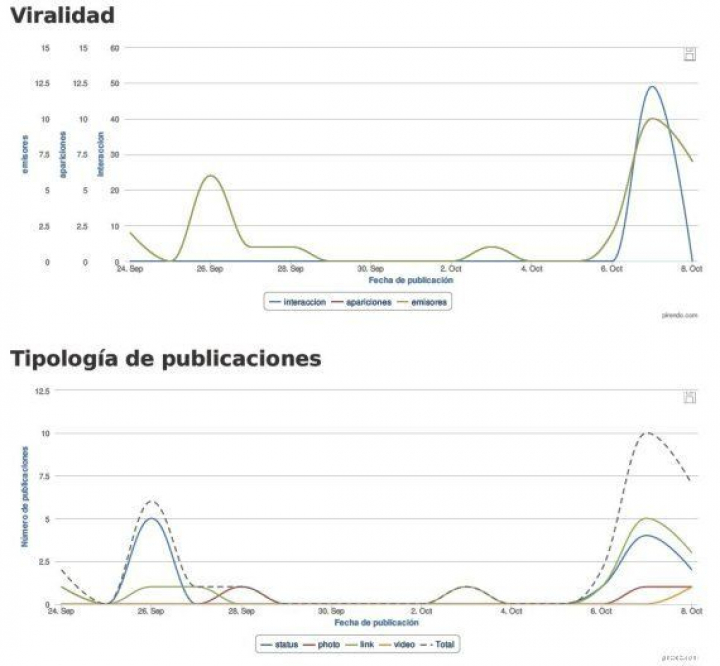 En Facebook, la herramienta de análisis Pirendo nos ofrece resultados muy parecidos, con picos de actividad el 26 de septiembre, un día después de la muerte en Madrid del religioso Manuel García Vallejo, y desde el 6 de octubre, cuando se supo del contagio de Teresa Romero, auxiliar de enfermería que le trató.