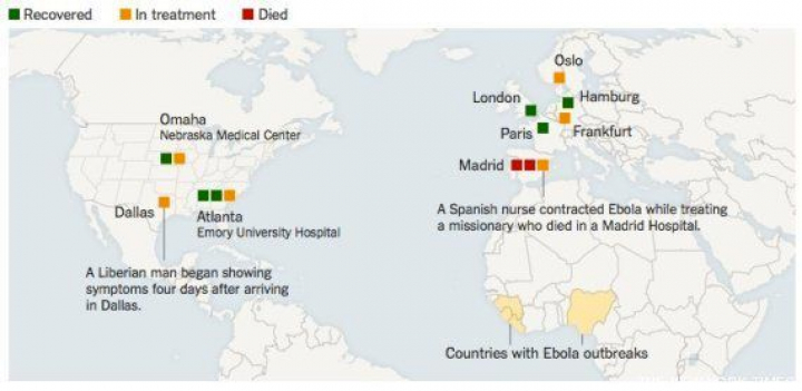 El diario The New York Times ha publicado un artículo con gráficos muy interesantes sobre el brote de ébola. Entre ellos este, en el que se muestran los enfermos de ébola que han sido tratados o están bajo tratamiento fuera de África. Los dos únicos pacientes expatriados que han fallecido, hasta ahora, han sido los dos religiosos españoles Miguel Pajares y Manuel García Viejo.