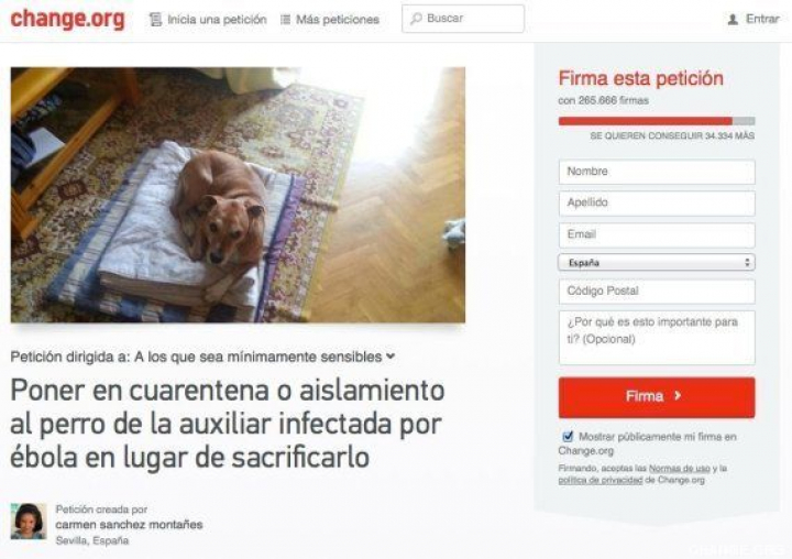 "No es justo que además del contagio del ébola por parte de la auxiliar a consecuencia de la falta de medios, pierdan al perro por un simple capricho, cuando es mucho más fácil aislarlo o ponerlo en cuarentena igual que han hecho con el marido de la víctima. Si está chica falleciera para su marido el perro, que los ha acompañado años atrás, sería un apoyo emocional importante. Para esta pareja no es 'sólo' un perro, es uno más de la familia", se explica en la petición pública.