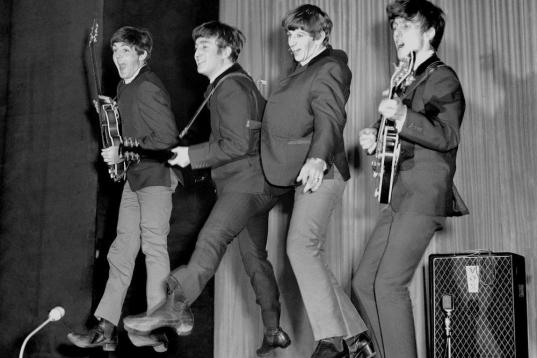 The Beatles jump on stage, left to right, Paul McCartney, Ringo Starr, John Lennon, and George Harrison.