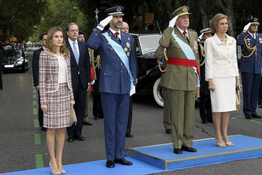 Al igual que la parada del año pasado, los actos militares estarán presididos por Don Felipe, pero esta vez como monarca, ya que el año pasado lo hizo todavía como Príncipe de Asturias en sustitución de Don Juan Carlos, quien se encontraba convaleciente de una operación de cadera a la que se había sometido unos días antes. Don Juan Carlos y Doña Sofía tampoco asistirán este año y sí lo harán por primera vez las hijas de los Reyes, la Princesa de Asturias y la Infanta Sofía.