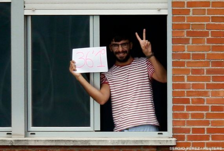 La imagen más difundida del día se tomó desde las puertas del Carlos III. Allí varios fotógrafos, entre ellos Sergio Pérez, de la agencia Reuters, captaron el momento en el que uno de los 17 ingresados se asomaba a la ventana para mostrar en un folio su temperatura corporal: 36,1. No tiene fiebre. Sigue asintómatico. Señal de la victoria.