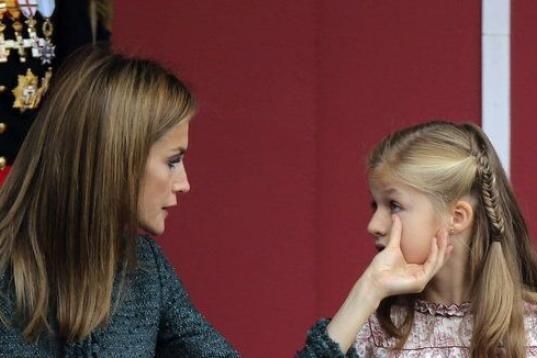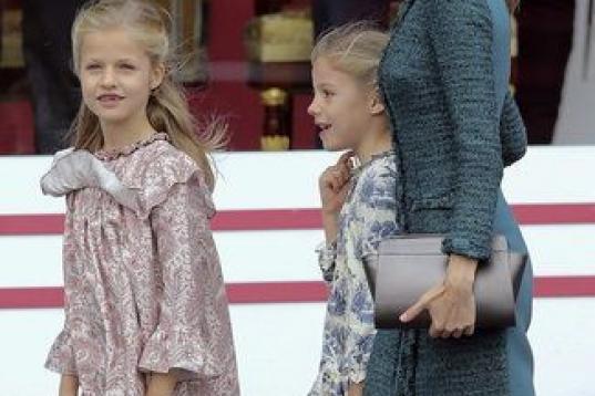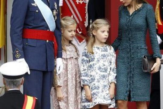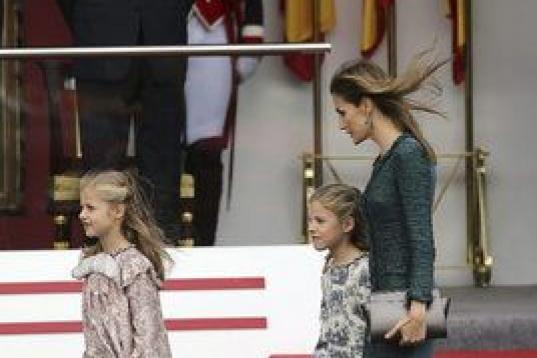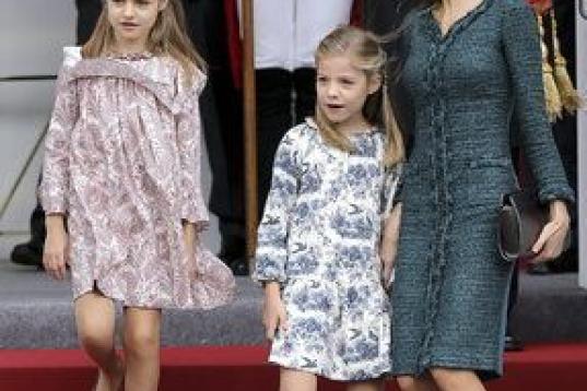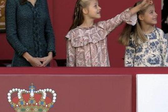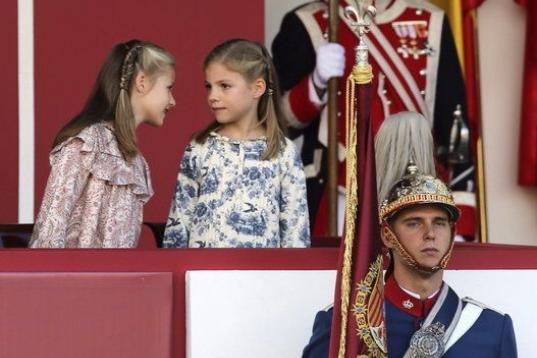 Leonor y Sofía han dejado algunas de las imágenes más graciosas de la mañana. La reina, siempre muy pendiente de las dos, las ha acompañado en todo momento. También cuando las dos niñas han dado la mano a los presidentes de las comunidades autónomas y a las autoridades militares.