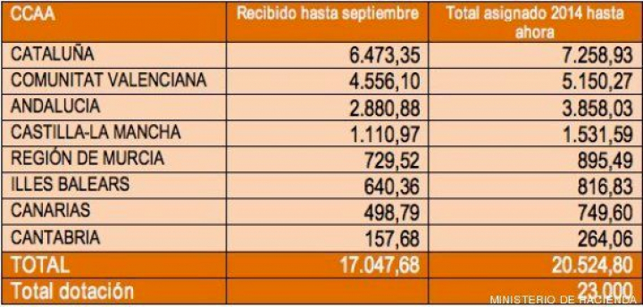 Según los datos del Ministerio de Hacienda y Administraciones Públicas, la autonomía que más ha usado en lo que va de año el fondo es Cataluña, que ha recibido algo más de 6.473 millones de euros (en total tiene asignado para 2014 un monto de 7.258 millones de euros).