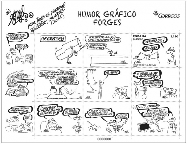 Este es el primer sello de la serie de Correos llamada Humor Gráfico. El autor ha elegido esta viñeta por ser una de las más conocidas, basada en un chiste entre sus padres. "Un día que mi padre estaba durmiendo la siesta, mi madre le despertó diciéndole que eran las siete y él contestó: que pasen", ha recordado Forges, quien acaba de publicar Coloréitor, durante la presentación.