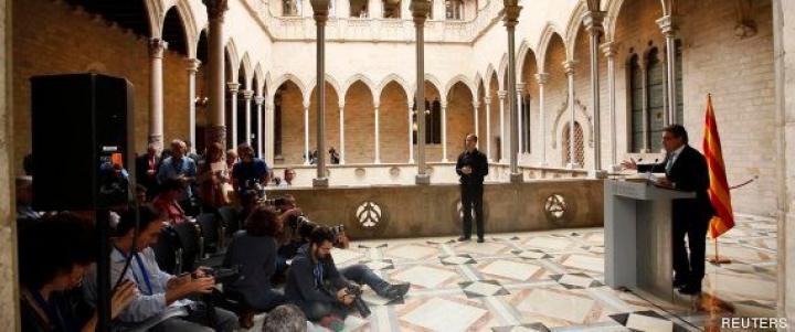 El sonido de las campanas se cuela por los arcos de la galería Gótica del Palau de la Generalitat. Artur Mas comparece solo. Lleva una hora y cincuenta dos minutos frente a las cámaras. Solo, sin el respaldo de sus hasta ahora compañeros de viaje del 9-N. Se desvela el misterio, su 'plan b'.