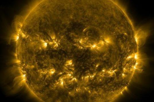 Las zonas activas del astro le dan la apariencia de una brillante calabaza sonriente. "Algunas áreas más brillantes porque esas son las áreas que emiten más luz y energía. Son marcadores de un intenso y complejo grupo de campos magnéticos flotando sobre la atmósfera del Sol, la corona", explicó la NASA en su web.