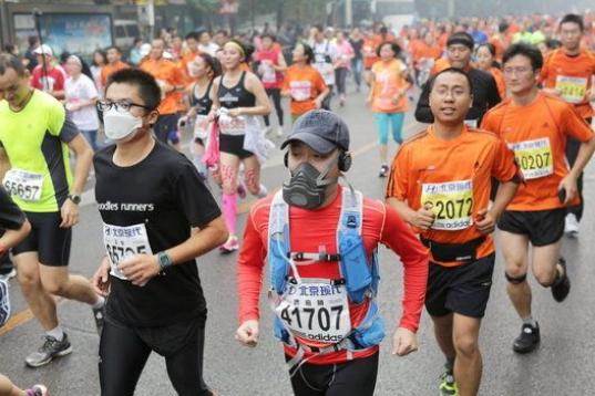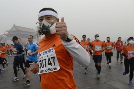 No había niebla, era contaminación. Muchos participantes en la Maratón Internacional de Pekín han corrido este domingo con mascarillas para protegerse de la tremenda polución que sufre la ciudad.