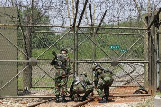 Un grupo de soldados de Corea del Sur en la frontera antes de dejar que pase un tren desde Corea del Norte.