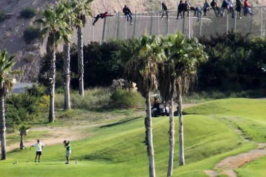 Los inmigrantes irregulares intentan cruzar la valla de la ciudad autónoma junto a un campo de golf. Sin palabras.