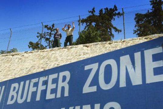 Dos hombre turco-chipriotas observan la zona desmilitarizada que divide la capital de Chipre, entre la parte turca y la chipriota.
