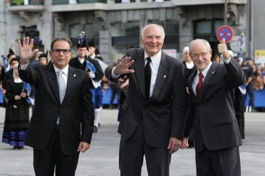 El químico valenciano Avelino Corma (d) y sus colegas estadounidenses Mark E. Davis (centro) y Galen D. Stucky (i), tras recibir de manos del rey Felipe el Premio Príncipe de Asturias Investigación Científica y Técnica.