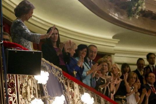 La reina Sofía saluda desde el palco de honor del teatro Campoamor de Oviedo.