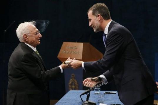 El arquitecto estadounidense Frank Gehry (i) recibe de manos del rey Felipe el Premio Príncipe de Asturias de las Artes.