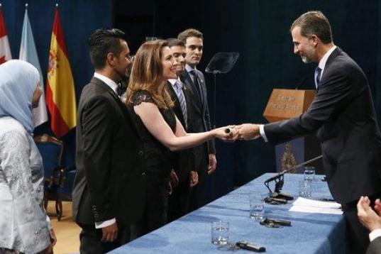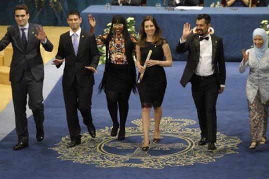 El rey Felipe VI tras hacer entrega del Premio Príncipe de Asturias a la Concordia 2014 a la periodista congoleña Caddy Adzuba.