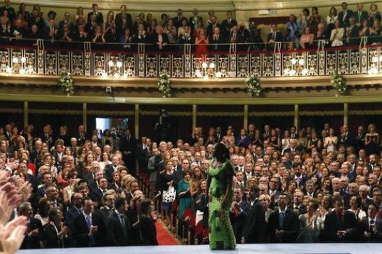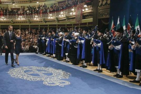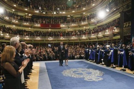 Los reyes de España, Felipe y Letizia, al inicio de la ceremonia de entrega de los Premios Príncipe de Asturias 2014 que se ha celebrado hoy en el Teatro Campoamor de Oviedo.