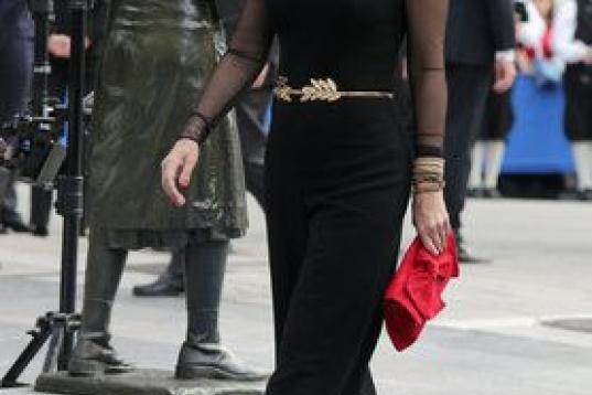 Rocasolano ha recorrido la alfombra azul del Teatro Campoamor de Oviedo luciendo un peinado ondulado similar al de Letizia hace dos años y un traje de dos piezas en blanco y negro. La madre de la reina ha escogido una chaquetilla de encaje negro sobre fondo blanco y una falda de los mismos colores, que ha conjuntado con unos zapatos, bolso y guantes negros.