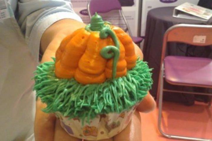 2. Haz la calabaza. Con la manga de color naranja y la boquilla número 12, presiona sobre el centro del cupcake.