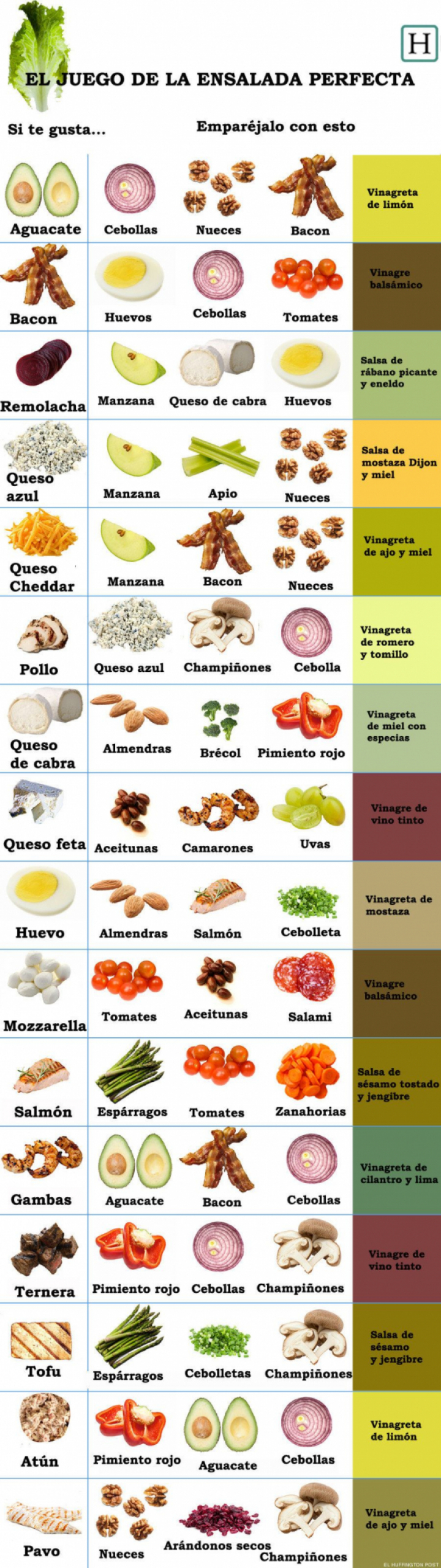 Para confeccionar la ensalada perfecta, debes empezar por la primera columna. Éste es el ingrediente de la ensalada que no estás dispuesto a sacrificar como puede ser el queso feta o el aguacate. Luego elige los ingredientes que aparecen a la derecha. Está comprobado que los ingredientes de cada una de las filas forman una mezcla perfecta. El libro ofrece muchas mezclas posibles pero este cuadro presenta los ingredientes más comunes en los sitios de venta de ensalada. De esta forma podrás elaborar una ensalada perfecta sin necesidad de añadir ingredientes adicionales ni incrementar el coste final de tu pedido. La infografía incluye también la información sobre cuál sería el aliño perfecto a cada ensalada.