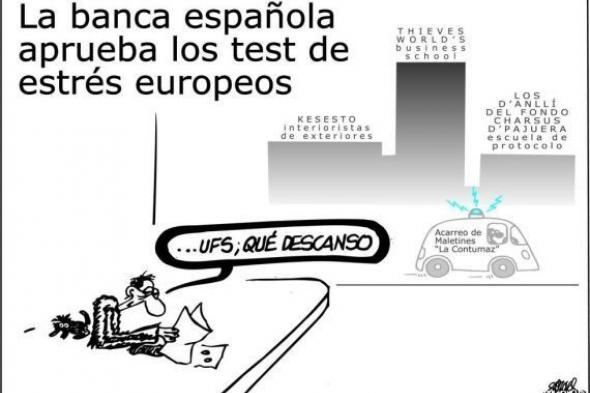 Un pobre que pide en una acera lee el titular de un periódico: "La banca española aprueba los test de estrés europeos" y comenta: "...uf, qué descanso". La ironía de Forges en su viñeta de El País se complementa en la pregunta que se hace unas páginas antes Joaquín Estefanía: "Entonces, ¿Por qué no hay crédito?". La respuesta la ofrecía el Fondo Monetario por boca de su responsable del área financiera, José Viñals: los bancos europeos, a los que se han inyectado 600.000 millones de euros, son "como un paciente al que el médico le dice que no está enfermo, pero que es un atleta y tiene que correr un maratón, y que para eso no está recuperado del todo". Sin embargo, El Mundo, en un editorial, estima que "una banca saneada y solvente ha de abrir ya la líneas de crédito" porque "no sería lógico que los esfuerzos realizados para ayudar al sector financiero no repercutiesen ahora a los ciudadanos".
