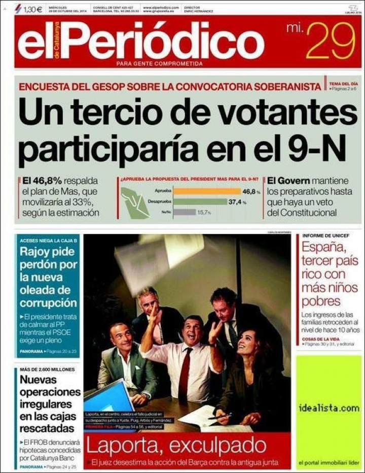 La mítica canción de Lluis Llach, L'estaca, se revitaliza con Podemos y el 9-N, destaca en primera La Vanguardia a raíz de una polémica desatada en Badalona porque el gerente de la televisión local prohibió el sábado pasado su interpretación en la entrega de premios del certamen local de cortos. L'estaca, que cuenta con una versión en árabe que acompañó a la primavera de Túnez y en polaco a las protestas del sindicato Solidarnosc, ahora anima los actos en favor de la consulta soberanista.