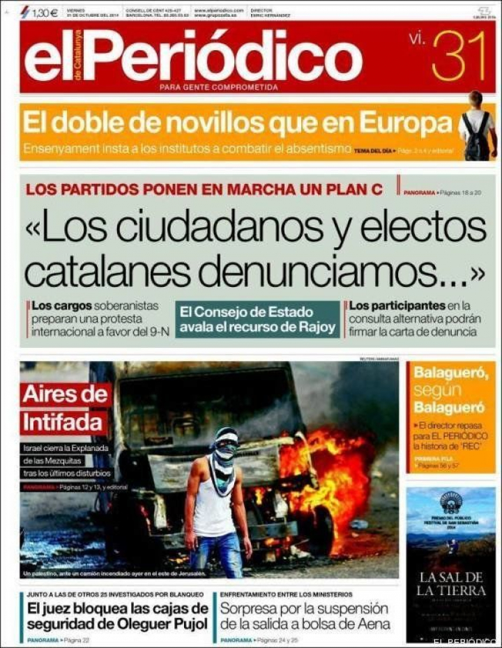 "Los partidos ponen en marcha un plan C", anuncia El Periódico. "Los cargos soberanistas preparan una protesta internacional a favor del 9N. Los participantes en la consulta podrán firmar una carta que comienza "Los ciudadanos y electos catalanes denuncian.