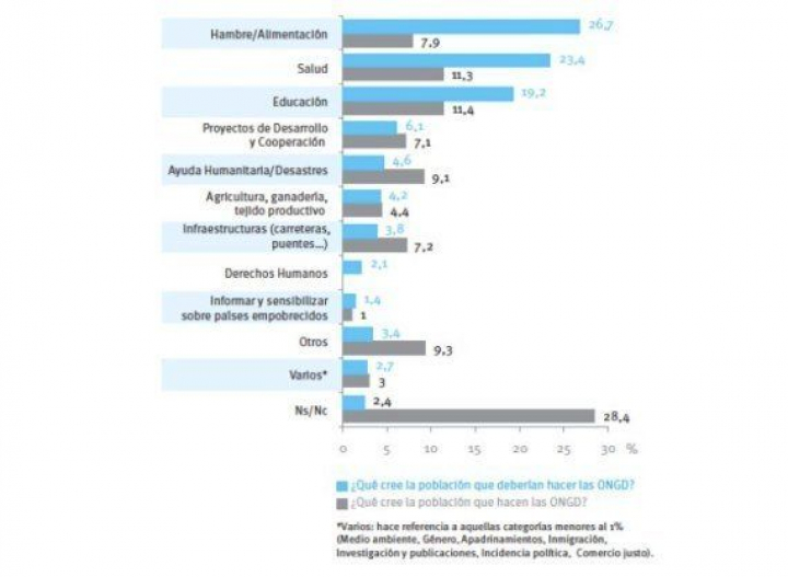 Sin embargo, la propia plataforma reconoce que hay una gran diferencia entre lo que los ciudadanos creen que deberían hacer las ONG y lo que creen que realmente hacen. En el siguiente gráfico se exponen respectivamente ambos puntos de vista (lo que deberían hacer y lo que hacen) por ámbitos concretos de actuación.