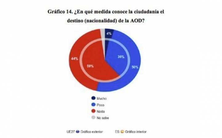 La parte interna del gráfico corresponde a España, la exterior, a la UE, donde el porcentaje de personas que desconocen el destino de la ayuda es sensiblemente inferior.
