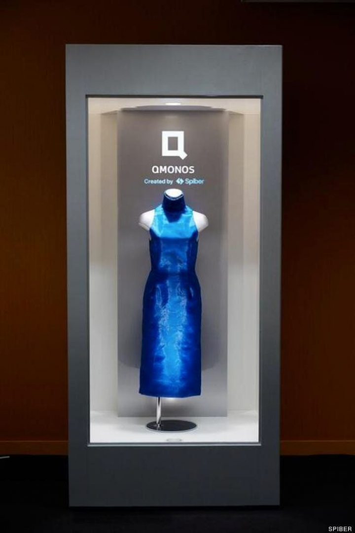 Una novedad en biomimética textil es la fibra que imita la tela de araña. En 2013 la compañía japonesa Spiber, nacida en la Universidad de Keio, presentó Qmonos (del japonés kumo-no-su, tela de araña), una fibra artificial basada en la seda de la araña. Para su debut, la empresa mostró un vestido de fiesta azul eléctrico confeccionado con ese tejido, que los investigadores han logrado fabricar cultivando bacterias modificadas para producir fibroína, una de las dos proteínas principales que constituyen la fibra de las arañas y los gusanos de seda.