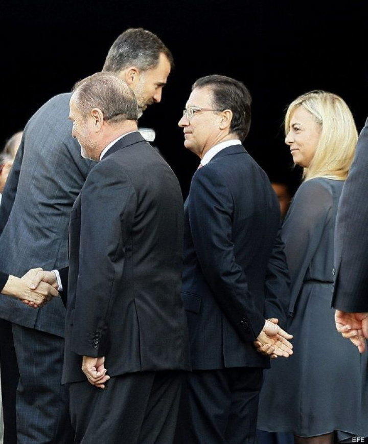 En una segunda fila de autoridades han saludado al rey el presidente de les Corts Valencianes, Alejandro Font de Mora, el delegado del Gobierno, Serafín Castellano, el líder del PSOE, Pedro Sánchez, el vicepresidente del Consell valenciano, José Císcar, y la alcaldesa de Alicante, la popular Sonia Castedo, imputada en dos causas judiciales de presunta corrupción urbanística.