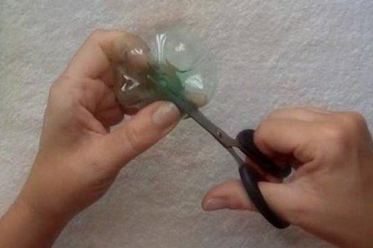 Corta la base de la botella con el cutter o la tijera y recorta la base del exterior al centro. Continuar como se explica en el blog