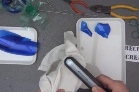 Cortar las perchas de aluminio para hacer los tallos de las flores con los alicantes. Cortar la botella de plástico azul en trozo irregulares, tal y como se muestra enl blog
