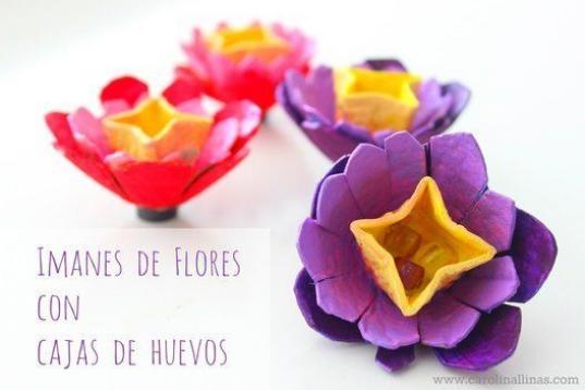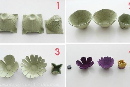 Lo primero es recortar las tacitas de la huevera (necesitas dos por cada flor) y luego los conos que hay en el medio (uno para cada flor). Córtalos para hacer los pétalos como aparece en la imagen 3 y píntalos con los colores q...