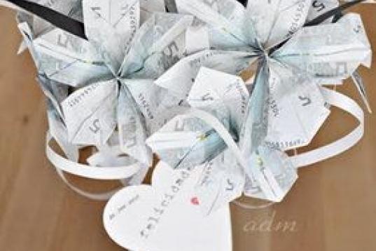 Seguramente nadie haría este ramo para su casa, pero es bastante divertido prepararlo como regalo de boda. El método es sencillo, sólo hace falta doblar. En esta web puedes ver cómo se hace.