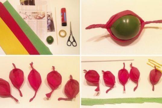 Recortar cinco trozos de papel rojo de 10x15 centímetros. Enrollar cada uno de los trozos alrededor de la pelota como si fuese un caramelo y después separarlos con cuidado. Después hacer los estambres de la flores con tiras de ...