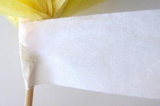 Comienza por recortar un pedazo de 8 cm de papel crepé plegado. Después haz un corte a lo largo de los extremos. Continúa el proceso como se explica en la web Nuestro Mundo Creativo.