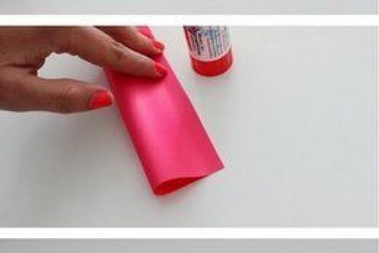 Recorta una tira de papel de 8 centímetro aproximadamente. Dobla para unir los extremos de la tira creando un arco pero sin marcar el pliegue. Pegar los extremos con la barra (tal como se ve en la imagen). Con las tijeras haz co...